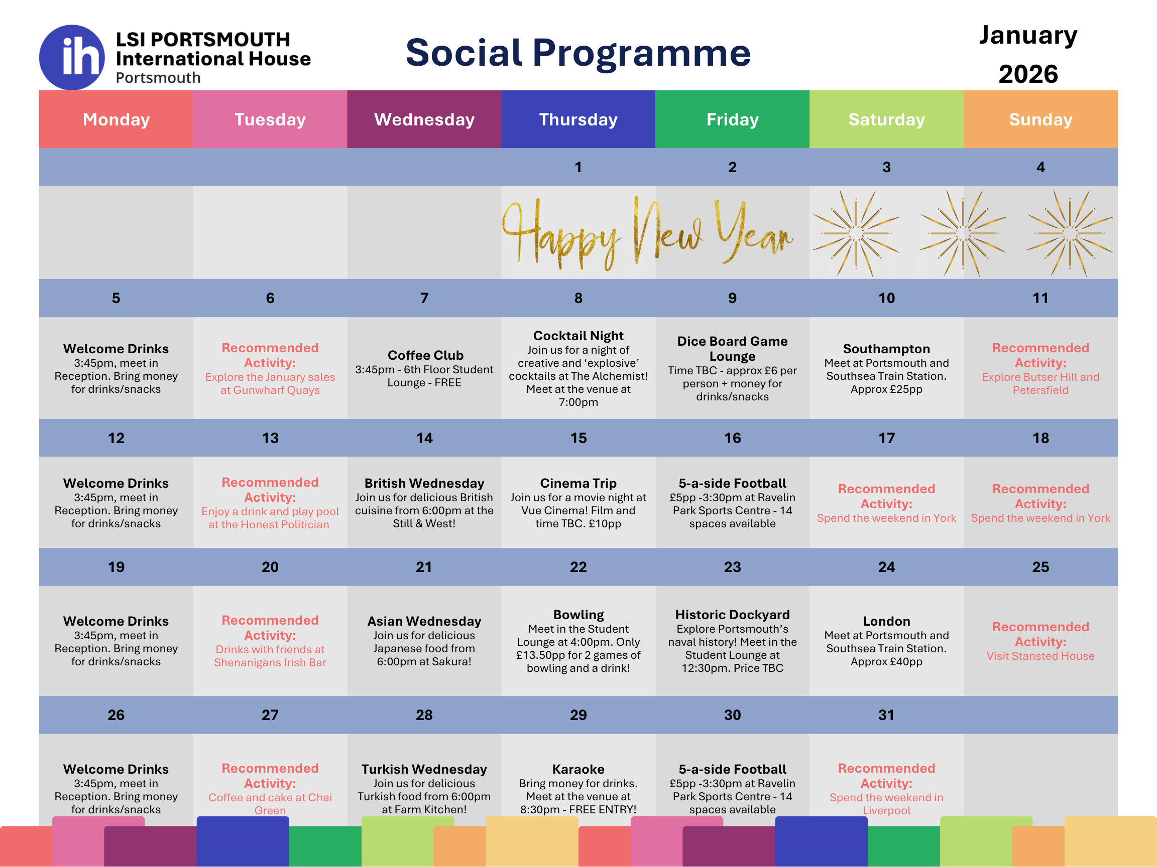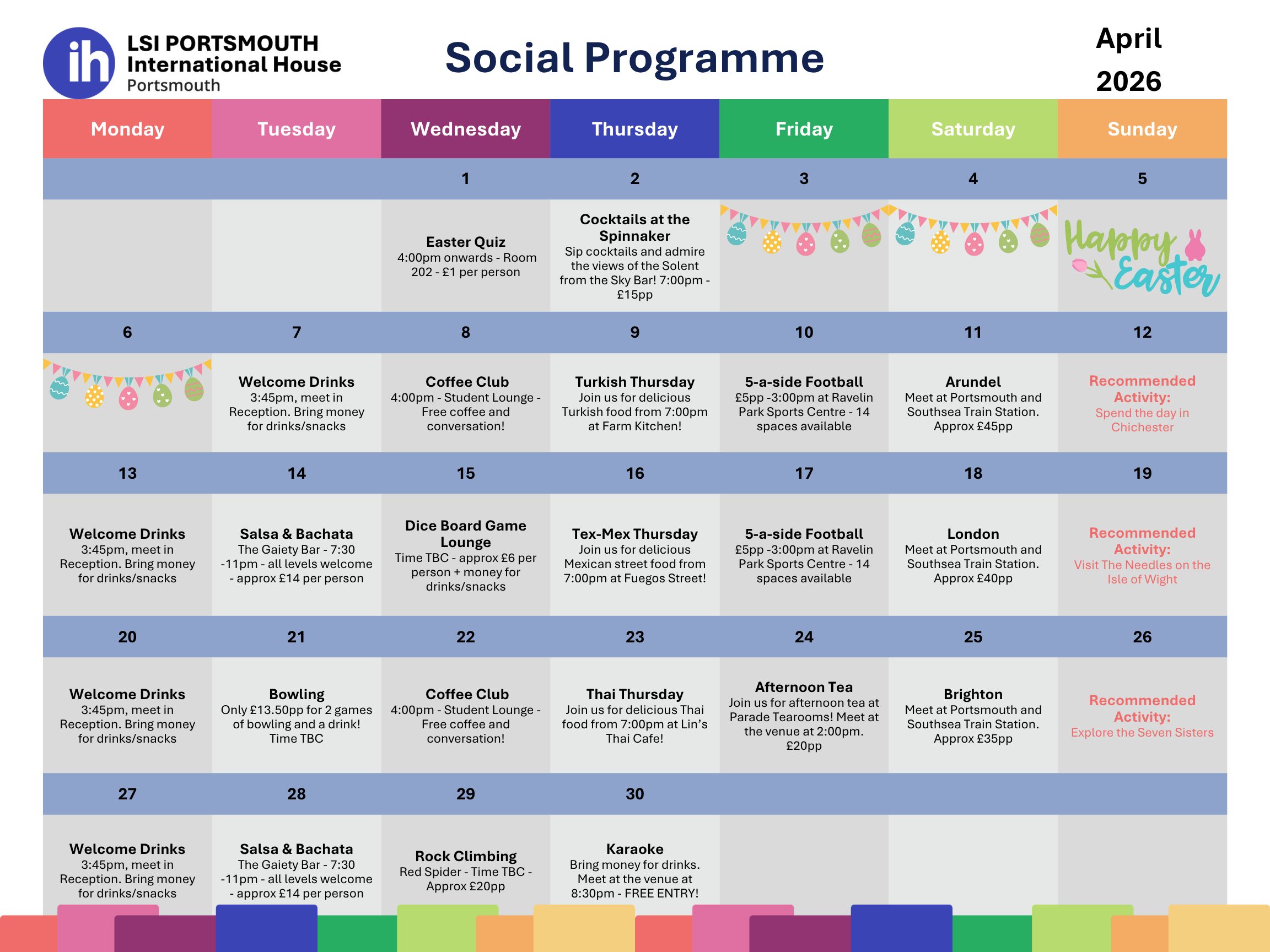 The social programme is a great way to meet new friends and explore Portsmouth and the surrounding areas, with activities such as welcome drinks on a Monday, movie afternoons and trips to other cities around the UK!